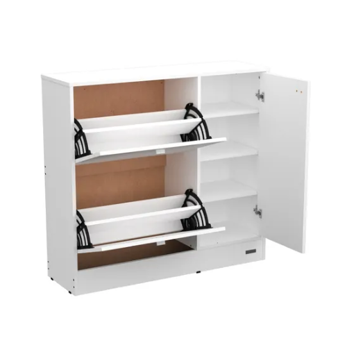 Cuenta dos cajones que permiten organizar hasta 10 pares de calzado y una puerta lateral ideal para la organizacion de botas, plataformas y zapatos de tacón, de manera conveniente y segura manteniendolos ocultos y al resguardo del polvo; mientras que su superficie brinda un espacio adicional de apoyo de fácil y rápido acceso.